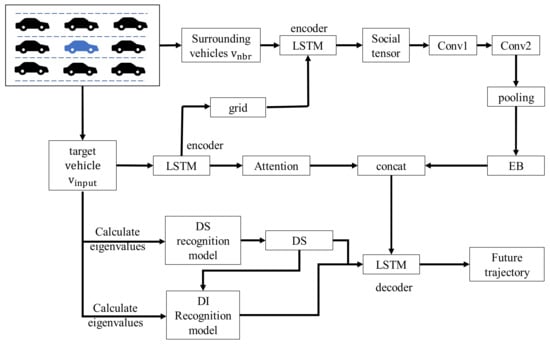 In this study, we improve the CS-LSTM prediction model with an attention mechanism, as originally proposed by Zhang et al. [21]. This improvement takes into account the driving style (abbreviated as DS) recognition model, considering both environmental factors and the dynamic human-like driving intention (abbreviated as DI) recognition model proposed in this study. These modifications cater to the unique characteristics of vehicle trajectory prediction. The design of our human-like vehicle prediction model is illustrated in Figure 1.