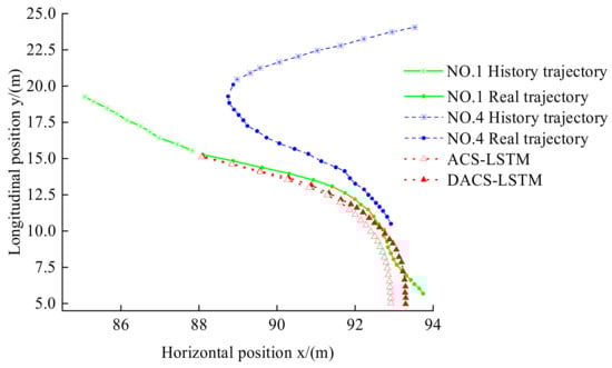 The ACS-LSTM model is more sensitive to the surrounding vehicles, demonstrating a more pronounced avoidance trajectory within the next 2 s. In contrast, our proposed DACS-LSTM model takes into account the aggressive driving style of this vehicle, initiating the avoidance maneuver only when Vehicle No.4 is significantly closer. This aligns well with the driving characteristics of aggressive drivers, who typically have a relatively low threshold for the distance between vehicles.