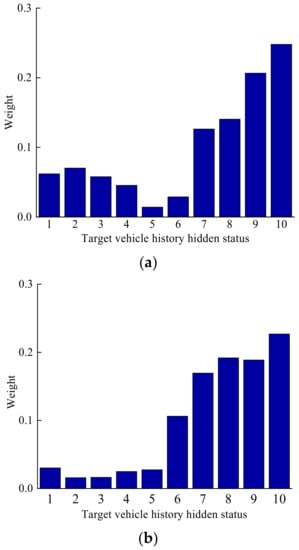 To further extract the crucial information in the temporal inputs, this model integrates the attention mechanism and improves the attention mechanism’s weight assignment based on the driving style. Figure 8 depicts the attention weight assignment for the target vehicle.