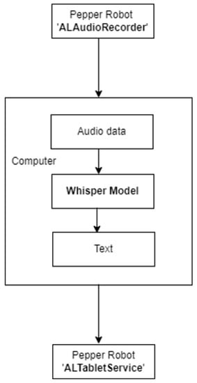 Whisper [40] is an open-source speech recognition model with a wide scope of applications. A comprehensive collection of audio data is used to train it. Whisper can be used to perform multiple tasks, such as speech recognition in multiple languages, speech recognition, and translation. The audio recordings from Pepper can be transferred to the computer system, which can be then used as input for Whisper. With the help of Whisper, the corresponding text file of recorded audio can be generated. Further, Pepper can be programmed to display this generated text on its screen.
