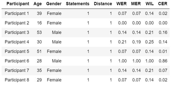 Research has shown that speech recognition systems can be significantly impacted by the age and complexity of statements spoken. Often, there may be some variations in children’s pronunciation when they state a word. Li et al. [46] demonstrated that children’s voices are more difficult for automatic speech recognition systems to process accurately compared to adults. Kennedy et al. [47] highlighted the importance of improving speech recognition for children, as it poses challenges for robots to comprehend. Speech features commonly observed in older people, including speech rate, pauses, redundancies, and diminished articulation and pronunciation, have been recognized by previous studies for increasing the Word Error Rate in automated speech recognition systems [48,49,50,51]. Differences in speech patterns and articulation between younger and older individuals can pose a challenge for automatic recognition systems. Due to above-mentioned challenges, the present study included participants from other age groups and identified that the WER is not affected by the age of the participant in the included age groups. This finding is also supported by Aman et al. [52], who explored elderly persons’ voice effects on ASR and showed a significant 34% increase in the average Word Error Rate between elderly and non-elderly individuals; however, they also showed that WER is not associated with age.