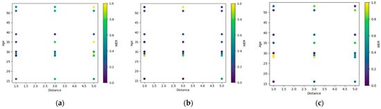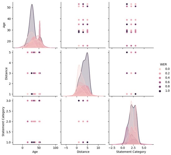 Figure 6 contains the overall visualization pairplot, which is used to analyze the relationships and distributions among the key variables: age, distance, and complexity of statements. The data points are distinguished based on color provided by the WER’s varying values. Each graph in the matrix shows information about the interactions between these variables. By using the pairplot, the possible patterns and correlations within the dataset can be identified, which can help in gaining insights into the data and making informed decisions. The scatter plots present in Figure 6 will be examined in detail later on in the present section.