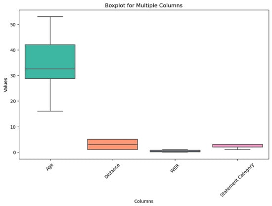 The boxplot in Figure 7 shows how the variables age, distance, WER, and complexity of statements are distributed. Each variable’s interquartile range (IQR) is represented by a box with a median line inside the box. This visualization provides valuable insights into each variable’s spread and central tendency, helping to understand how they are distributed.