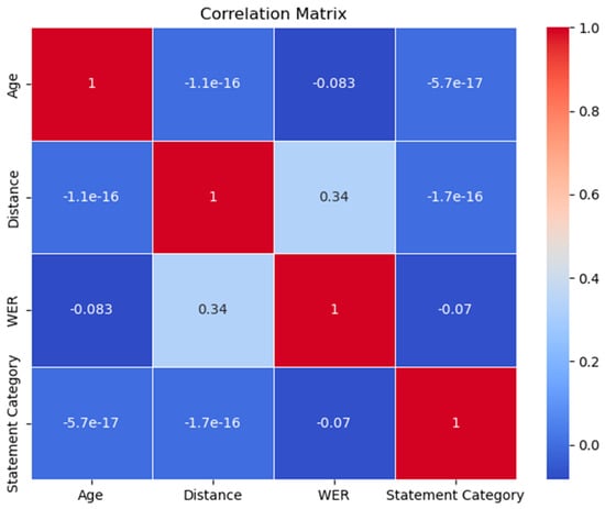 Correlation matrix of variables age, distance, WER, and statement category.