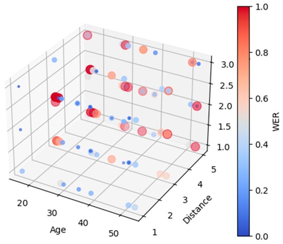 In Figure 9, age, distance, and complexity of statements were focused on. The scale of the WER showed the range of WER values. A lower WER value indicates higher speech recognition accuracy [45]. The blue bubbles in Figure 9 indicated the WER values less than 0.5. The darker color of blue represented high accuracy, while the red bubbles denoted the WER values greater than 0.5. The dark red color was indicative of less accuracy. Some WER values overlapped, making it difficult to interpret any pattern. Thus, further exploration is required to visualize this more efficiently. Hence, 2-dimensional values of these characteristics were considered.