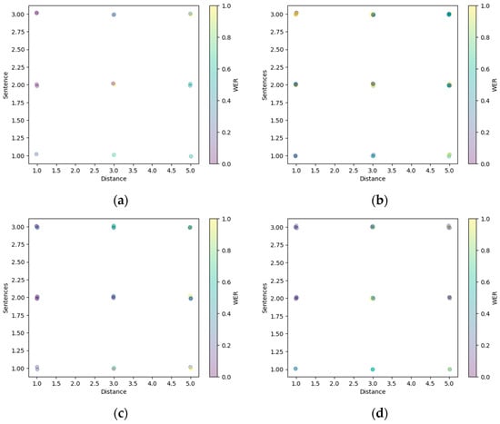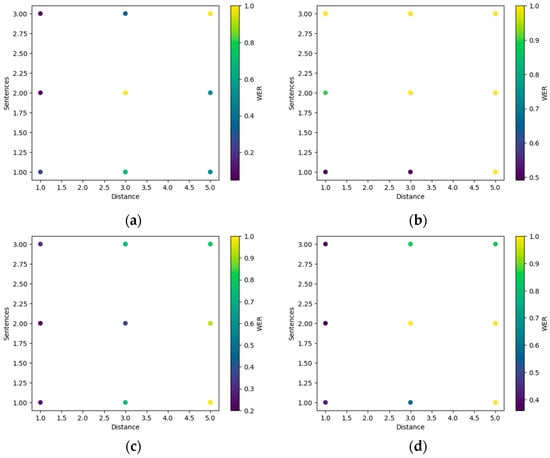 Maximum WER values for various statements and distances for different age groups, (a) ages below 20, (b) ages from 21 to 30, (c) ages from 31 to 40, (d) above age 50.