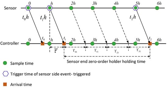 Through the analysis of the above event-triggered threshold conditions (2) and (5), the relationship between the set of periodically sampled signal-release times at the sensor, the set of the event-triggered signal-release times at the sensor, and the set of event-triggered signal-release times at the controller can be seen: . The values of and are not only related to the change of the sensor sampling system state and controller output but also to the two event-triggered parameters and .