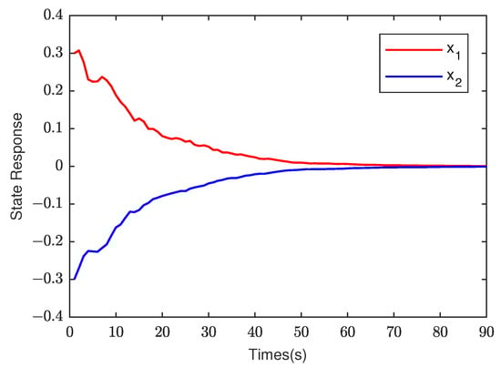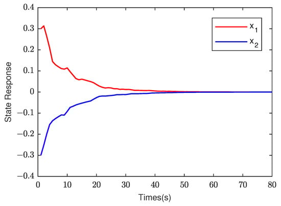 Case3: Considering system (13) under condition (5), the parameters are set to , , , and . Applying Corollary 2, by making use of the LMI toolbox, the gain matrix is obtained as , and Figure 5 is the system state response curve.