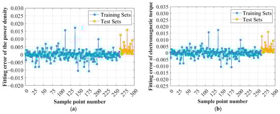 Fitting error diagram for the different optimization objectives. (a) Fitting error plot for the power density. (b) Fitting error diagram of the electromagnetic torque. (c) Fitting error diagram of the cogging torque. (d) Fitting error plot of the torque fluctuation coefficient.
