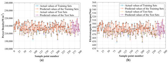 Furthermore, Figure 10 illustrates the results of fitting the GA-BP neural network to the four optimization objectives. The visualization of these results provides a clear and comprehensive understanding of the network’s ability to accurately represent and predict the optimization objectives. This further substantiates the effectiveness and practicality of the GA-BP neural network in facilitating the motor optimization design process.