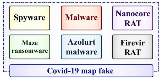 Adversaries try to install malicious code on people’s computers. According to [10], adversaries used online interactive COVID-19 maps, fake news, websites, and phishing emails to take advantage of people’s fears and need for information to introduce the Azolurt malware and steal credentials and accounts. More than 600 malicious applications were detected during COVID-19 [22]. API endpoints seem to be targeted by malicious actors following imprisonment measures across the planet, with one attack seeing fifteen million events aimed toward one single API endpoint for the Android app [23]. Anyone with a link could access confidential documents related to the UK’s NHS coronavirus trailing app hosted in Google Drive. The documents contain privacy protection information and further plans the app could take [24]. Over 6400 Edison Mail users were hit by a security bug that allows others to access an account in an update rolled out on its iOS app [25]. The following are the most impactful attacks carried out on mobile devices during the COVID-19 pandemic (see Figure 1).