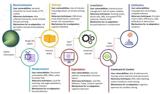 The results obtained reflect a probable fact known by security experts; the cybersecurity strategy also depends on a cognitive approach. So, one of the main issues today in the context of the COVID-19 pandemic is the environment of uncertainty where users and cybersecurity specialists need to improve their cognitive agility. To understand the process that an attacker could use, in this study we adopted the cyber kill chain model [77] that includes the following phases: reconnaissance, weaponization, delivery, exploitation, installation, command and control, and exfiltration with psychological factors during the COVID-19 pandemic.