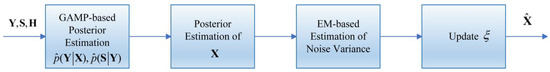 For the purpose of tackling the PAPR reduction problem in the massive multiuser MIMO-OFDM-ADMA system, we first apply the EM-TGM-GAMP algorithm. To estimate the joint likelihood probability function in this framework, the GAMP algorithm is integrated into the variational architecture of the EM algorithm. As is well known, the GAMP algorithm is a simplified version of the loopy basis pursuit. It is often used to approximate the likelihood and the marginal posteriors. Here, the GAMP scheme is applied to make an iterative estimation of the likelihood function , i.e., . Then, the variational EM method gives the new estimators of and the corresponding noise variance simultaneously. The main idea of the angular domain EM-TGM-GAMP algorithm is depicted in Figure 1, and the whole iteration procedure is shown in Algorithm 1. Specifically, the iterative update procedure of parameter is given by [37].
