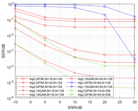 In Figure 3 and Figure 4, the number of subcarriers is indicated as 128 and 256, respectively. The values of SER are shown to decrease as the number of subcarriers increases. Figure 3 demonstrates the SER versus the signal-to-noise ratio (SNR) when both the quadrature phase shift keying (QPSK) and the 16-quadrature amplitude modulation (QAM) are considered, and the BS is equipped with different antennas. The constant envelope precoding is taken into account, with the elements of uniformly distributed in a unit circle. It is shown that the SER performance improvement of Algorithm 2 is fairly noticeable when varies from 16 to 64. Moreover, the SER performance of Algorithm 2 is better than that of Algorithm 1, especially in the regime of low SNR. For instance, the SER of Algorithm 2 is about 0.54 dB lower than that of the Algorithm 1 under the QPSK modulation when SNR equals 10 dB and . Moreover, the SER of Algorithm 2 with 64 antennas established at the BS is around dB when SNR rises to 30 dB. However, for Algorithm 1 with QPSK modulation, the value of SER is about dB. Figure 3 also depicts the SER performance of different schemes under the circumstance of the 16QAM. As expected, the SER of Algorithm 2 with 64 antennas at the BS is reduced by 0.04 dB when compared to the framework with 32 antennas established at the BS. Notably, the SER performance of Algorithm 1 with 64 antennas is worse than that of the Algorithm 2 with 16 antennas at the BS.