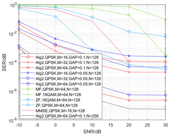 The annulus constrained precoding is designed in Figure 4, and the elements of are uniformly distributed in three concentric circles. The values of the radius length of these three concentric circles are assumed to be 0.9, 1.0, and 1.1 with GAP = 0.1, and 0.95, 1.0, and 1.05 with GAP = 0.05, respectively. As expected, regardless of whether the value of GAP is equal to 0.1 or 0.05, the SER performance of Algorithm 2 improves dramatically as the number of BS antennas grows from 16 to 64. Furthermore, Figure 4 demonstrates that for a given number of BS antennas, the values of SER with GAP = 0.1 are lower than those with GAP = 0.05. Additionally, it should be pointed out that under conditions of small SNR (SNR below 10 dB), there is little difference in SER performance between , GAP = 0.1 and , GAP = 0.05. Particularly, the value of SER can almost arrive at under the modulation of QPSK when GAP = 0.1, SNR = 20 dB, and . As well, it is discovered that the value of SER is less than when GAP = 0.05, while SNR and remain unchanged. Figure 4 also depicts the SER performance using matched filtering (MF), zero forcing (ZF), and traditional MMSE methods. It is observed that the SER performance of MF and ZF is worse than that of Algorithm 2. Specifically, the traditional MMSE scheme is close to that of Algorithm 2 in the regime of high SNR. However, it is acquired at the high cost of PAPR suppression performance.