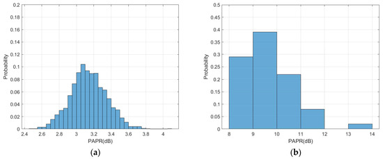 Figure 5 demonstrates the PAPR reduction performance of Algorithm 1 and the MF scheme when under QPSK modulation. It is shown that neither technique’s PAPR performance is up to par. To be specific, all values of PAPR in Figure 5a fall around between 2.4 dB and 4 dB when Algorithm 1 is adopted here. Figure 5b contrasts this with the values of PAPR obtained using the MF method, which have a probability higher than 0.9 and fall between 8 dB and 12 dB. That is to say, it is impossible to achieve the tradeoff between PAPR reduction and SER performance using these two schemes.
