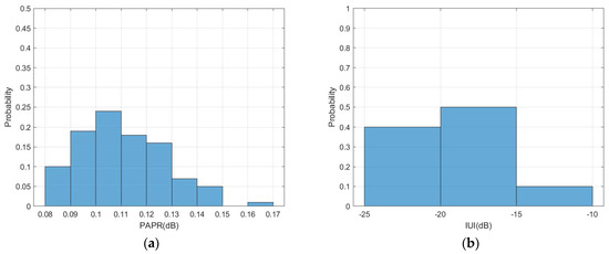 Figure 6 illustrates the PAPR and the interuser interference (IUI) performance of Algorithm 2 when and QPSK and 16 QAM are used for modulation. It is observed in Figure 4 that the proposed Algorithm 2 reduces PAPR in a suitable manner and improves the IUI performance in Figure 6a,b. Specifically, the values of PAPR are smaller than 0.15 dB with a probability greater than 0.95 in Figure 6a. In Figure 6b, the values of IUI ranges from −25 dB to −10 dB as well. This means that the proposed technique achieves a favorable trade off in terms of SER, PAPR reduction, and the IUI performance.