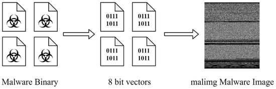 In this paper, the malimg dataset was selected by studying publicly available datasets on the web. This dataset contains most of the malware classes. Although there is a data imbalance in the malimg dataset, this can be addressed by adding experimental content. This dataset contains 9339 grayscale images of malware from 25 classes. The principle of generating this dataset is that a given malware binary is read as a vector of 8 bit unsigned integers and then organized into a 2D array []. This can be visualized as a grayscale image in the range [0,255] (0: black, 255: white) []. The generation process of the gray images is depicted in Figure 1 and the details in the dataset are shown in Table 1.