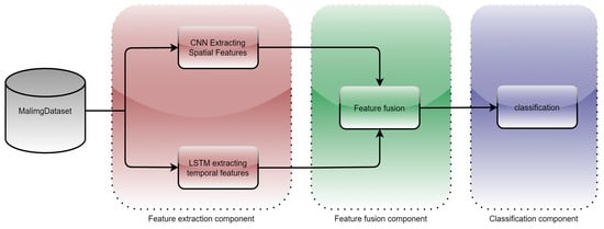 This study found that the method of feature fusion does help the classifier to improve the accuracy of the classification []. The model proposes a deep learning fusion of temporal and spatial features for malware classification. The parallel feature fusion method enables the model to capture both spatial and temporal features of malware texture images, which not only improves the accuracy of the model, but also helps to enhance the robustness of the model. The method fills the gap in parallel feature fusion for malware. The main contributions of this paper are the following: