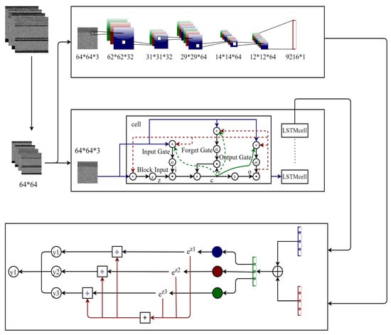 Similarly, the LSTM network extracts temporal features from grayscale images of size 64 × 64. The LSTM network model was proposed by Hochreiter and Schmidhuber []. Compared to the traditional RNN (recurrent neural network) LSTM model, it introduces three gating units: the forget gate, the input gate and the output gate. In digital circuits, a gate is a binary variable (0,1), where ‘0’ represents the closed state, not allowing any information to pass through, and ‘1’ represents the open state, allowing all data to pass []. In the LSTM network, a gate is essentially a fully connected layer, taking a vector as input and outputting a real-value vector ranging from ‘0’ to ‘1’. This reflects which information is permitted to pass through at a certain ratio. Memory cells, as the core of LSTM, are responsible for storing and transmitting messages. Memory cells are composed of a linear unit and a nonlinear unit. A linear unit is a simple adder used to add the memory cells from the previous time and the input from the current time. A nonlinear unit is a sigmoid function used to control the flow of information. The following are the main functions of the three gates of LSTM: