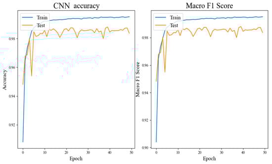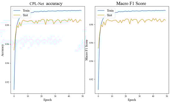 Figure 6, Figure 7 and Figure 8 and Table 3 illustrate that the CNN network achieves a classification accuracy of 98.3% for grayscale images of malicious code. LSTM, being more suitable for sentiment analysis of texts, has an accuracy rate of only 92.7% when no preprocessing is applied to the dataset. The accuracy rate of the CPL-Net reaches 98.7%. Although the accuracy improvement of CPL-Net compared to CNN is only 0.4%, and the F1 value improvement is only 0.2%, the curve shows that CPL-Net has better stability than CNN. The CNN network showed a significant decrease in accuracy and F1 value during the fifth training epoch, while CPL-Net maintained a relatively stable range throughout the training process. Through ablation experiments, we conclude that CPL-Net can improve the accuracy of detecting malware texture images and has better stability. However, compared to the CNN network, the improvement effect of CPL-Net is not particularly significant. The following experiments will ameliorate the model’s feature fusion and classification components to further improve the accuracy and stability of CPL-Net.