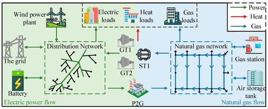 Figure 1 shows the architecture of the gas-power system. Among them, gas turbine (GT), steam turbine (ST), and power-to-gas (P2G) units are coupling equipment of power system and natural gas system. GTs and ST are power sources. In this paper, the combination of two GTs and one ST is adopted. Because the operation of a steam turbine mainly relies on the waste heat and smoke generated by the gas turbine, the power output of the steam turbine depends on the operating status of the gas turbine. GT can convert natural gas into electric energy and generate the steam required for ST power generation. The coordinated operation of GT and ST can further improve the flexibility of the system to provide backup. P2G can convert electrical energy into natural gas. In addition, the system also includes energy storage devices and renewable energy.