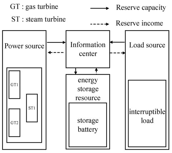 The gas-power system consists of a power generation unit, energy storage device, and interruptible load. Therefore, the gas-power system source-load-storage multiple reserve capacity system can be constructed from the power supply side, the energy storage side, and the load side, as shown in Figure 2. The power supply side mainly relies on GT and ST to provide reserve capacity; the battery in the energy storage device can act as the standby power supply of the system; interruptible load can also provide reserve capacity for the system.