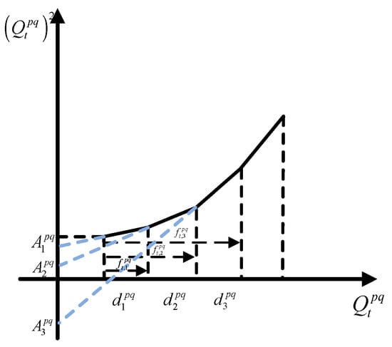 The linearization process of the natural gas network is shown in Formulas (39)–(45). By dividing the abscissa Q t p q into m parts, m primary curves are constructed. Formula (39) is the square of the Weymouth equation. Formula (40) is piecewise linearization. The Formulas (41)–(45) are used to judge that the natural gas system works in a certain segmentation interval.
