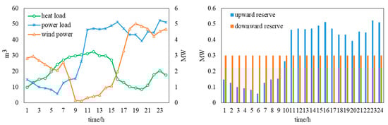 The example scenario constructed in this paper includes two gas turbines, a steam turbine, a P2G unit, an energy storage battery, and a wind power plant. The purpose of this paper is to study the operation of a gas-power system with multi-type reserve participation. The load, wind power forecasting, and reserve demand in this paper are shown in Figure 4.