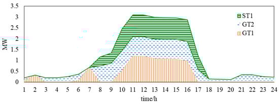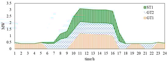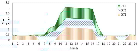(2) In the 6–7 periods, the heat load level is high. To meet the load demand and reserve demand, case 1 chooses GT2 + ST1 to operate together, and the output of GT2 is at a high level. In the case of case 3, the unit does not need to consider the reserve demand and only needs to select the best operation mode that can meet the electrical load and thermal load at the same time.