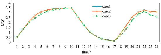 From the Figure 5, Figure 6 and Figure 7, it can be seen that compared with cases 1 and 2, case 3 changes the operation mode of the unit during the period of low load and high wind power. During the period of 3–5, because the power generation cost of GT1 is less than that of GT2, case 1 chooses GT1 to generate power to take into account the reserve demand and heat load demand, and the power generation is higher. In case 3, due to the participation of energy storage batteries in providing backup, the amount of steam generated by GT2 is greater than that of GT1 under the same power generation. Therefore, the small amount of electricity generated by GT2 can meet the heat load demand of the period and take into account the backup demand. Although the power generation cost of GT2 is high, the power generation is small, and the cost is still less than that of case 1. The reasons for the change of unit operation mode in the 19–20 and 23–24 periods are the same as above. In the 6–7 period, the heat load level is high. To meet the load demand and reserve demand, GT2 + ST1 are selected to operate together, and the output of GT2 is at a high level. In case 3, the unit does not need to consider the reserve demand and only needs to select the best operation mode that can meet the electrical load and thermal load at the same time.
