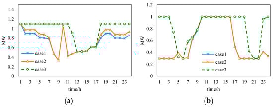 (1) In the periods of 3–5, because the cost of GT1 power generation is less than that of GT2, case 1 chooses GT1 power generation to take into account the reserve demand and heat load demand, and the power generation is higher. In case 3, due to the participation of energy storage batteries, the amount of steam generated by GT2 is greater than that of GT1 under the same power generation. Therefore, a small amount of electricity generated by GT2 can meet the heat load demand of this period and take into account the reserve demand. Although the power generation cost of GT2 is high, the power generation is small, and the cost is still less than that of case 1. The reasons for the change of unit operation mode in the 19–20 and 23–24 periods are the same as above.