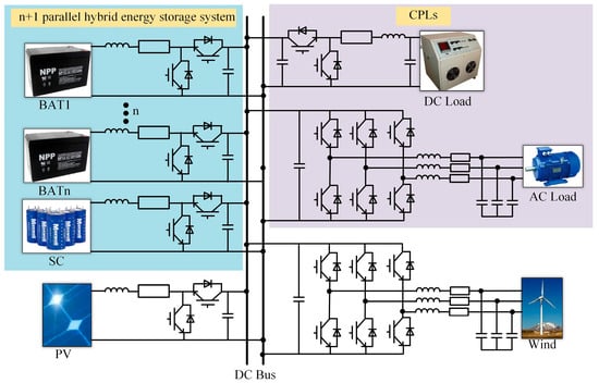 Islanded DC microgrids consist of microsources, HESSs, and CPLs, as shown in Figure 1. The microsources mainly comprise renewable energy, such as wind and solar power. Wind generators and three-phase bridge rectifiers are cascaded to obtain DC power. A boost converter is used to increase the voltages of the PV units. The HESSs are composed of n batteries cascaded with bidirectional buck–boost converters and one SC which is also cascaded with buck–boost converters. In other words, there are n+1 parallel energy-storage converters in the HESS. Buck converters are adopted to support the DC loads. All closed-loop-controlled loads, such as converter loads and motor loads, are usually regarded as CPLs with negative impedance characteristics. When the DC bus voltage changes, the positive feedback introduced by the CPLs usually magnify these changes, resulting in instability.