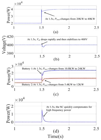 Simulation results when Group B is utilized. (a) The CPLs’ power, (b) DC bus voltage, (c) the power of battery 1 and battery 2, and (d) the SC’s power.
