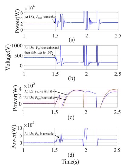 Then, the waveforms of power of the CPLs, the DC bus voltage, and the power values of battery 1, battery 2, and the SC when the parameters in Group B are adopted are all shown in Figure 14. At 1.5 s, the power of the CPLs changes from 20 kW to 60 kW; unfortunately, violent power oscillations appear. Furthermore, large oscillations also occur in the DC bus voltage and the power values of the batteries and the SC. Figure 14 demonstrates that the parameters in Group B could not guarantee that the islanded DC microgrids with three parallel energy-storage converters would be stable during large disturbances.