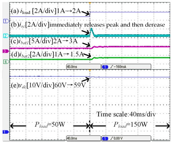 Then, the waveforms of the CPL current, DC bus voltage, and the currents of battery 1, battery 2, and the SC when the parameters in Group E are adopted are all shown in Figure 19. At 1.5 s, the power of the CPLs changes from 50 W to 210 W, the SC immediately releases a peak current, and the batteries’ currents increase gradually. However, the DC bus voltage continuously drops and is not able to return to the rated value. The voltage error between the rated value and the final value is more than 5%. Figure 14 demonstrates that the parameters in Group F could not guarantee that islanded DC microgrids with three parallel energy-storage converters remain stable during large disturbances.