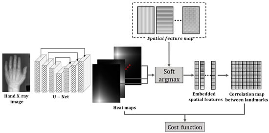 Figure 2 provides an overview of the proposed method for medical landmark localization. First, the hand X-ray image is fed into the U-Net architecture [,] to generate landmark heatmaps. Second, each landmark heatmap is transformed into the embedded spatial feature vector by using the soft-argmax method and the spatial feature maps. Third, we generate the correlation map between landmarks based on the spatial feature vector. In the training phase, the loss is minimized by evaluating both heatmaps and the correlation map. Since the proposed approach adopts an end-to-end learning approach, only a single feedforward execution is necessary during the test phase to localize all landmarks.
