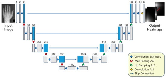 The U-Net architecture, as illustrated in Figure 3, is comprises repeating modules that consist of two 3 × 3 convolutions (with padding), each followed by instance normalization, RELU activation, and 2 × 2 max-pooling (for encoding layers) or up-sampling (for decoding layers). In the encoding layers, the count of feature maps was gradually increased from 64 to 1024, while in the decoding layers, it decreased from 1024 to 64. A skip connection was employed to concatenate identically scaled output maps between the encoder and decoder layers. Within the U-Net outputs, each landmark is represented by an individual Laplace heatmap channel, which is a normalized grayscale image ranging from 0 to 1. The highest intensity within the heatmap indicates the coordinates of the respective landmark. Output heatmaps are two-dimensional matrices with 37 channels, corresponding to the number of landmarks.