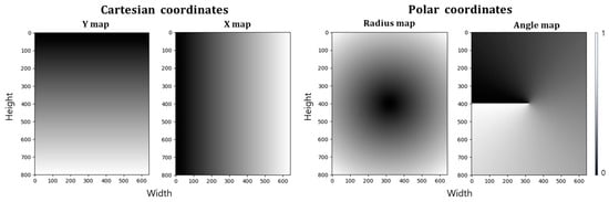 In this study, we employed the two spatial features of Cartesian and Polar coordinates. Figure 4 illustrates the two spatial feature maps employed in our study. From left to right, we can observe both Cartesian coordinates and Polar coordinates. The Cartesian system includes two features that reflect the x- and y-axis maps, while the Polar system includes maps for radius and angle. Before applying soft-argmax pooling, each feature map is normalized using the 2D-instance normalization function provided by the Pytorch API without learnable parameters. In the proposed approach, the feature map normalization process is essential due to its excessively large scale, leading to suboptimal performance.