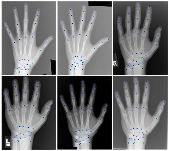 Visualization results of the proposed model in the Digital Hand Atlas dataset. Green dots are the ground-truth, while blue dots are the prediction results.