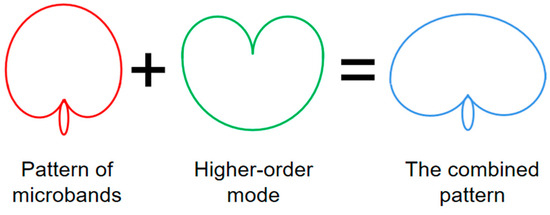 We know that due to the larger limitations on the ground, the microstrip antenna itself has a weak radiation ability on the back side, so it has a directional radiation pattern pointing to the normal direction. The radiant power density decreases with increasing θ, and the gain is relatively low near the equatorial angle. In the higher-order mode of the microstrip antenna, there is a heart-shaped radiation pattern with a maximum radiation direction of ±45°. The vertical direction has zero radiation (θ = 0°), and the 45° direction has the greatest radiation capacity (θ = ±45°). When the microstrip antenna simultaneously excites a directional radiation pattern that points to the normal direction and a radial pattern that has a heart shape, if the two modes are gradually close together, they will affect each other, and their modes will be combined so that their directional patterns will be superimposed on each other. The results are shown in Figure 1 [21].