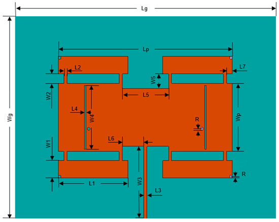 Figure 2 and Table 1 respectively show the specific shape and detailed parameters of the proposed dual-frequency microstrip antenna. The antenna is printed on a single-layer grounded F4BM220 substrate with a profile height of 2 mm, dielectric constant r = 0.02, and loss angle tangent tan δ = 0.0009. Specifically, the antenna is modified on a rectangular patch and four horizontally oriented parasitic metal strips, which are then connected to the rectangular radiant patch by eight short microstrip lines. Four metal posts are then added to the four metal strips to make the patch and floor shorter. Two symmetrical slots are etched into the radiant patch, and two metal posts are added next to the slots. The antenna was finally connected to the radiator by a microstrip wire and fed through a 50ΩSMA feed welded to the microstrip wire, and then the designed antenna was extensively studied using HFSS 15.0.