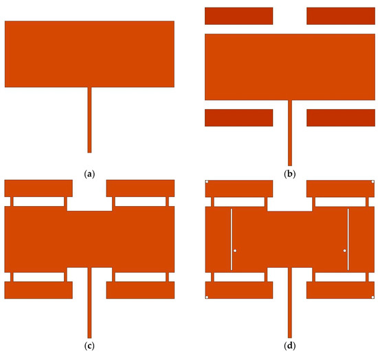 As is well known, the microstrip antenna in Figure 3a has a narrow HPBW in the TM10 mode. Meanwhile, non-transverse radiation patterns can be generated at a higher TM12 mode [11]. In order to solve these problems and generate the required wide HPBW, we take the following measures: (1) Introduce the horizontal metal bands as shown in Figure 3b, and add four horizontal metal bands to the rectangular radiation patch to stimulate the characteristic modes so that the rectangular patch is not excited. (2) By connecting the rectangular radiation patch with the metal band in Figure 3c, the original radiation characteristics are changed, the characteristic modes in the lower frequency band are moved to the working frequency band, and the radiation modes are combined to realize the purpose of broadening HPBW. (3) Load the metal into the four corner holes in Figure 3d, similarly move the characteristic modes in the lower frequency band to the working frequency band, and cut linear slots on the patch to enhance the interaction between various modes and achieve rectangular beam radiation. Through these arrangements, the antenna design is improved at the same time, namely with thin, dual frequency, wide fan beam, wide E-plane HPBW and flat top radiation beam.