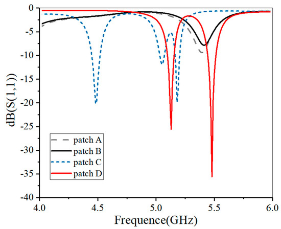 Figure 4 simulates patches A-D for |S11|. It can be found that patch A has only one resonant frequency in the 4 to 6 GHz band, and in the lower frequency range, |S11| has a decreasing trend, and there may be a resonant frequency. The introduction of metal bands in patch B does not have much effect on the original resonant frequency, and the purpose of introducing metal bands is to stimulate new characteristic modes. In patch C, by connecting the rectangular patch to the metal strip with a microstrip line, it can be found that the original resonant frequency is slightly shifted to the lower frequency, and the resonant frequency in the lower frequency band is gradually moved to the working frequency band. In patch D, the loading of the short circuit through the hole stimulates the drastic change of the first vibration frequency, making it gradually close to the second and third resonant frequencies. At the same time, the linear gap will help eliminate the notch band in the working frequency band, so that multiple modes can influence each other to produce a combined mode. A detailed characteristic mode analysis is presented in the next section.