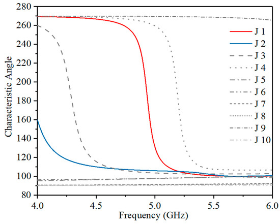 When the feature angle is 180° or the modal significance is 1, the feature modes are excited. It can be seen from Figure 5 and Figure 6 that patch A excites four feature modes in the operating frequency band 4 to 6 GHz, namely J1, J2, J3 and J4. It can be found that the feature angle and the maximum modal significance of mode J2 are beyond the operating frequency band, so mode J2 is excited in the lower frequency range, while other modes are excited in the higher frequency.