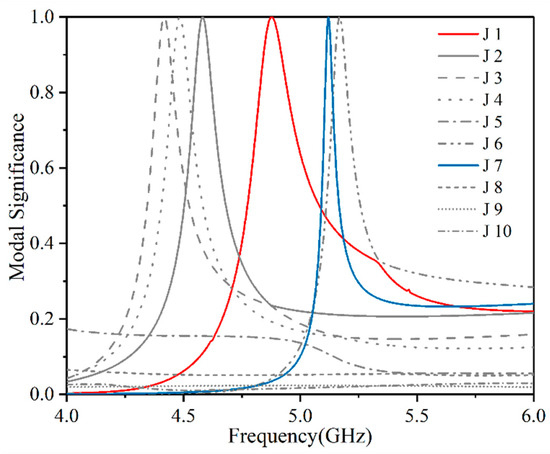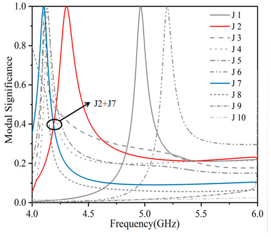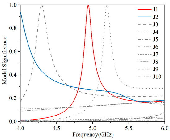 In this paper, a metal strip is introduced to generate a new current path, which excites a new characteristic pattern. The modal significance of metal strip patch B is shown in Figure 8. In the frequency band of 4 to 6 GHz, patch B excites A total of 8 modes, among which the modes (J1 to J3) are consistent with that of piece A, so there is no more analysis. We will focus on the five remaining modes of patch B (J4 to J8).