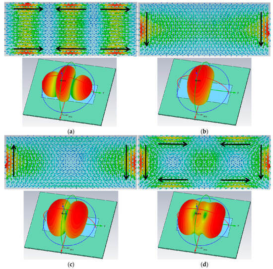 Modal current and radiation patterns for patch A. (a) J1. (b) J2. (c) J3. (d) J4.