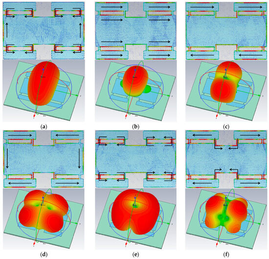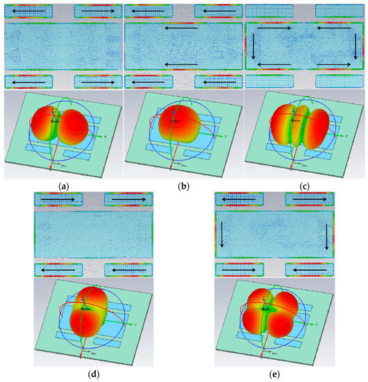Figure 9 plots the corresponding mode current and radiation directions of the modes studied by patch B at resonant frequencies. It can be found that the mode current J4 in Figure 9a is mainly concentrated on the metal strip. Due to the opposite current paths on the left and right symmetric metal bands, a heart-shaped radiation pattern radiating in the direction of ±Y axis 45° is generated. The mode current J5 in Figure 9b is concentrated at the upper and lower ends of the metal strip and the rectangular patch, respectively, and the current on the metal strip and the rectangular patch is in the same direction, resulting in a directional radiation pattern. The current of mode J6 in Figure 9c is mainly concentrated on the rectangular patch, which is exactly the same as the current characteristics of mode J4 in Figure 7d and also generates a huge sidelobe, while the main lobe is almost non-existent. The mode current J7 in Figure 9d is also mainly concentrated on the metal strip, but the current paths on the upper and lower symmetric metal strip are reversed, resulting in a heart-shaped radiation pattern radiating 45° along the ±X axis. The mode current J8 in Figure 9e is also mainly concentrated on the metal strip, where the current path on the upper and lower symmetric metal strips is opposite, and the current path on the left and right symmetric metal strips is opposite, forming the characteristics of quadrupole radiation. It can be found that both modes J4 and J7 produce the heart-shaped pattern shown in Figure 1, but mode J2 radiates a fan beam in the xoz plane. Therefore, only the combination of mode J7 and mode J2 can effectively extend the E-plane HPBW. As can be seen from Figure 8, the modal significance of the combined mode (J2 + J7) is 0.4, and its combination effect is not ideal. Only when the modal significance of the combined mode is greater than 0.7 can the two modes be effectively combined. It is recommended to connect the metal strip and the patch with a microstrip line to make the J2 mode and J7 mode resonate in the same frequency band.