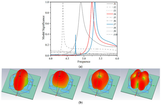 (a) Modal significance of patch E. (b). Radiation modes of patch E (J1, J2, J4, J7).