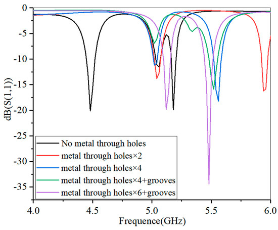 In Figure 13, the change process of the S-parameter after loading metal through holes and slots in Figure 3c,d is plotted. It is found that there are three resonant frequencies in the operating band when loading without metal through holes, and the first frequency is not required, so it needs to be moved out of the operating band without affecting the position of the second frequency. With the increase in the number of through-holes, the first resonant frequency gradually moves to the high frequency, the position of the second resonant frequency has almost no effect, and the third resonant frequency moves slightly to the high frequency, which is because the position of the metal through-hole loading is located at the low potential of the electric field of the second resonant frequency, which will not cause a drastic change in impedance. When the number of metal pieces through holes is gradually increased to four, the first resonant frequency moves out of the operating frequency. By etching the slot, the current feature is disturbed so that a new frequency is generated between the two frequencies, and then two metal pieces through holes are loaded next to the slot so that the newly generated frequency point and the resonant frequency point on the right side are fused to produce a rectangular radiation beam.